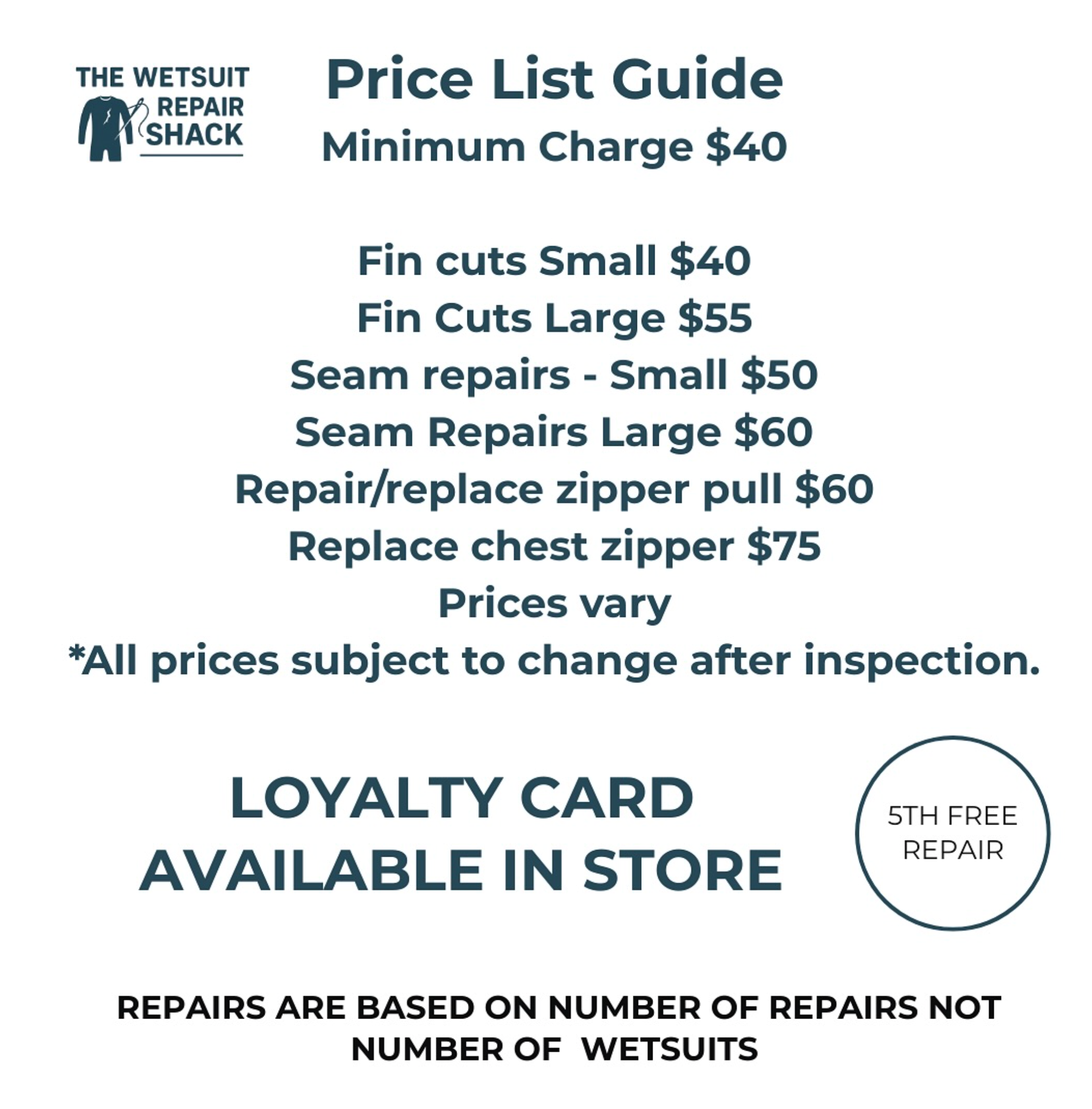 Prices vary, so please bring your damaged wetsuit into the Boardsox Shop so we can assess it and give you a reasonable price!
